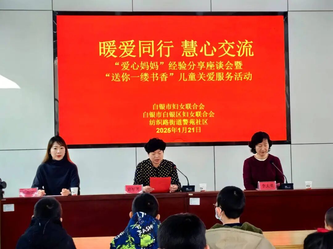 为深入贯彻学习习近平总书记关于妇女儿童和妇联工作的重要论述精神,坚守为党育人、为国育才的初心使命,构建横向联动、纵向贯通、协调高效的留守儿童和困境儿童关爱服务体系,用心用情守护儿童健康成长,全力推动全市“爱心妈妈”结对关爱工作取得实效,1月21日, 白银市妇联联合白银区妇联、纺织路街道警苑社区开展暖爱同行慧心交流“爱心妈妈”经验分享座谈会暨“送你一缕书香”儿童关爱服务活动,市区妇联有关领导、爱心妈妈、结对儿童以及志愿者共计80余人参加了活动。