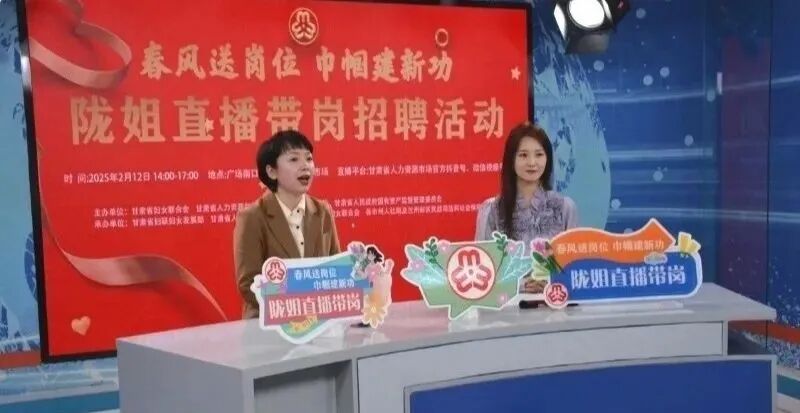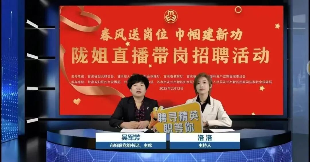2月12日, 省妇联 组织全省14个直播间同步举办陇姐直播带岗招聘活动,8个市州妇联主席走进直播间参与互动交流,活动以“职业指导+技能培训展示+岗位推荐”相结合的方式,吸引了20余万人驻足观看。 定西市妇联 负责人走进直播间宣讲相关政策,5位企业负责人走进直播间在线“揽才”,1.06万多名求职人员线上观看观看,达成意向性协议134人。 白银市妇联 组织41家企业215个优质岗位参与直播带岗,邀请8位企业负责人推介岗位,有效满足不同层次女性求职者的需求。 兰州新区妇联 联合新区组织部、新区民政司法和社会保障局同步开展“春风送岗位 巾帼建新功”陇姐直播带岗招聘活动,组织116用工单位为女性求职者提供就地就近就业服务。