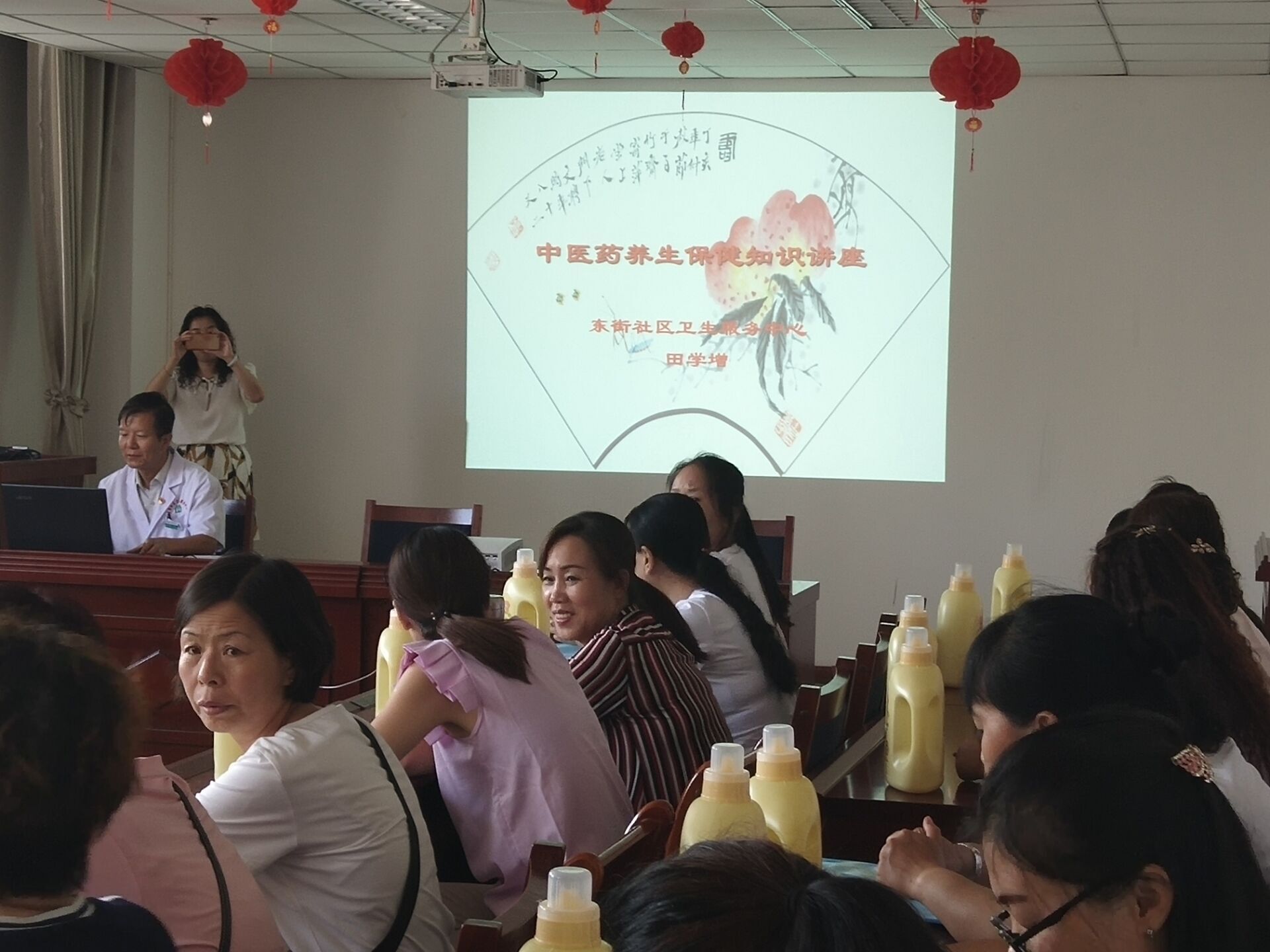健康讲座。邀请卫生服务中心的医生开展中医药养生保健知识讲座,根据“春夏养阳”的原则,利用夏季气温高,机体阳气充沛,体表经络中气血旺盛,腠理开泄的有利时机,理论结合实例为居民讲解冬病夏治的原理,倡导居民群众养成良好的生活和卫生习惯,增强自我保护能力,全面提高健康水平。