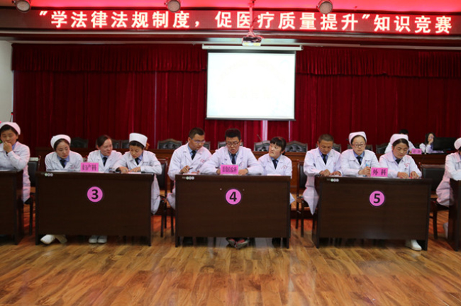 为进一步提升医疗质量,加强法律法规和22项医疗核心制度学习,使全院医务人员掌握法律法规知识,提高职工的法律素质,促进医疗质量和医疗安全,结合“七五”普法、岗位大练兵和党的“两学一做”专题教育,近日,肃南县医院妇委会组织开展了“学法律法规,促医疗质量提升”知识竞赛活动,7个科室的21名医务人员参加了竞赛,竞赛分必答环节、小组共答环节和风险题选答三个环节,内容包括医疗废弃物处置、危急值报告、医师管理办法及处方、病历书写规范等,现场高难度的问题一个接一个,参赛者应答快速、正确率高,特别是风险题的案例分析,答题者论述完整到位、理由充分,赢得了大家的一致好评。比赛现场气氛活跃、积极性高、角逐激烈,最后内科以领先50分的优势,获得一等奖。紧张激烈的竞赛充分体现了医务人员好学上进、比学赶拼的良好风貌。县团委、、县妇联、县总工会、县司法局、县卫计委领导观摩了此次知识竞赛。