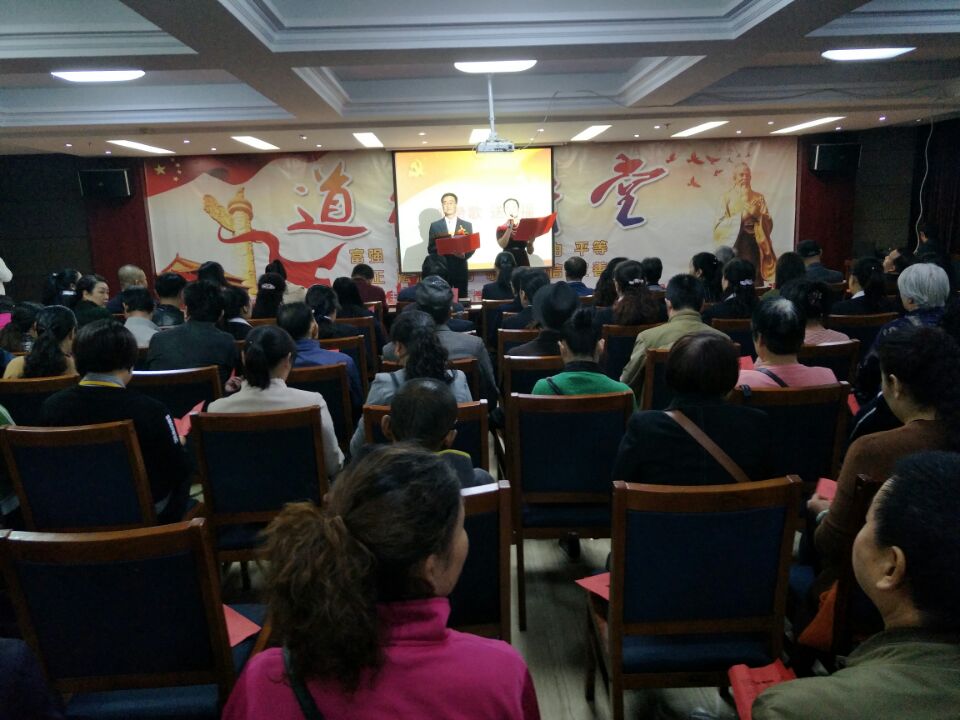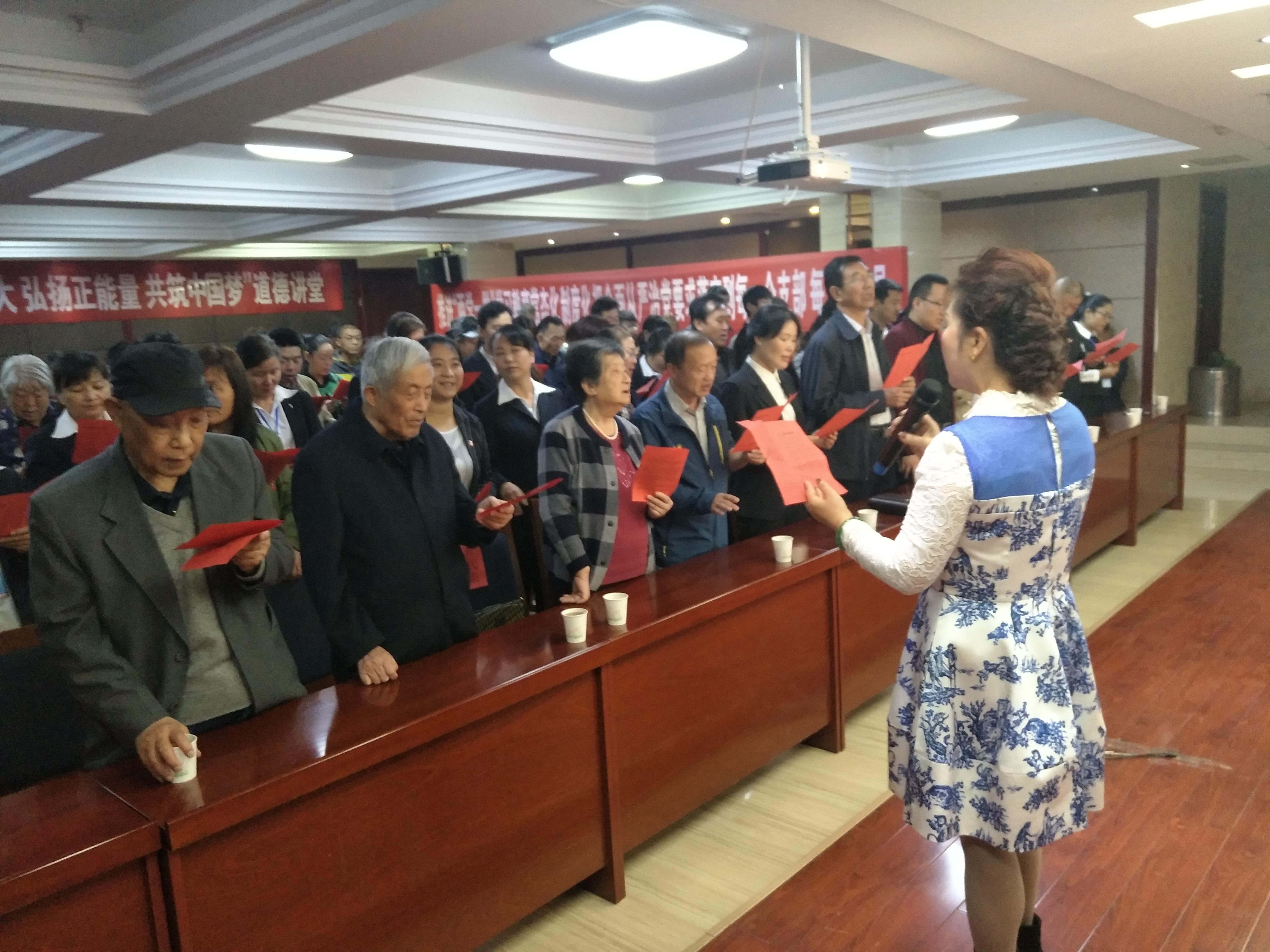 为全面践行和培育社会主义核心价值观,增强公民道德建设的感召力和亲和力,吸引广大干部群众积极投身道德实践活动,凝聚谱写幸福美好家园新篇章的强大精神力量,以优异的工作成绩喜迎党的十九大。在中秋、国庆佳节来临之际, 近日上午,南街佛城社区在昭武大酒店五楼会议室举办“喜迎国庆节、献礼十九大、弘扬正能量、共筑中国梦”道德讲堂。街道全体领导、联系社区的科室、各社区书记、主任、副书记、佛城社区全体工作人员、辖区知青代表、两代表一委员、退休老党员、知名人士、爱心人士、商会会员共计120余人参加活动。