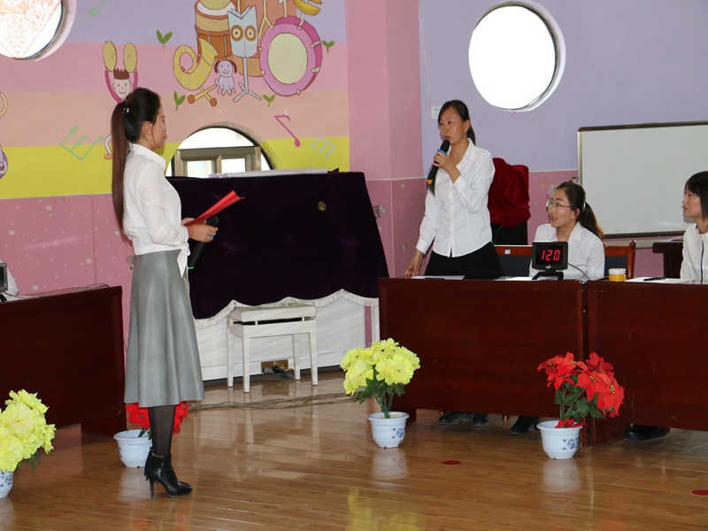 下午四点钟竞赛活动准时开始,首先由活动负责领导武桂香主任向在座的领导、老师汇报此次活动的目的意义,接着,主持人赵巧梅老师依次介绍各队的参赛队员、宣布赛场纪律、介绍比赛流程,最后在观众们热切的期盼和场上选手紧张与激动交错的眼神中,主持人大声宣布“山丹县清泉幼儿园巾帼心向党 建功新时代教师保育知识竞赛”开始!