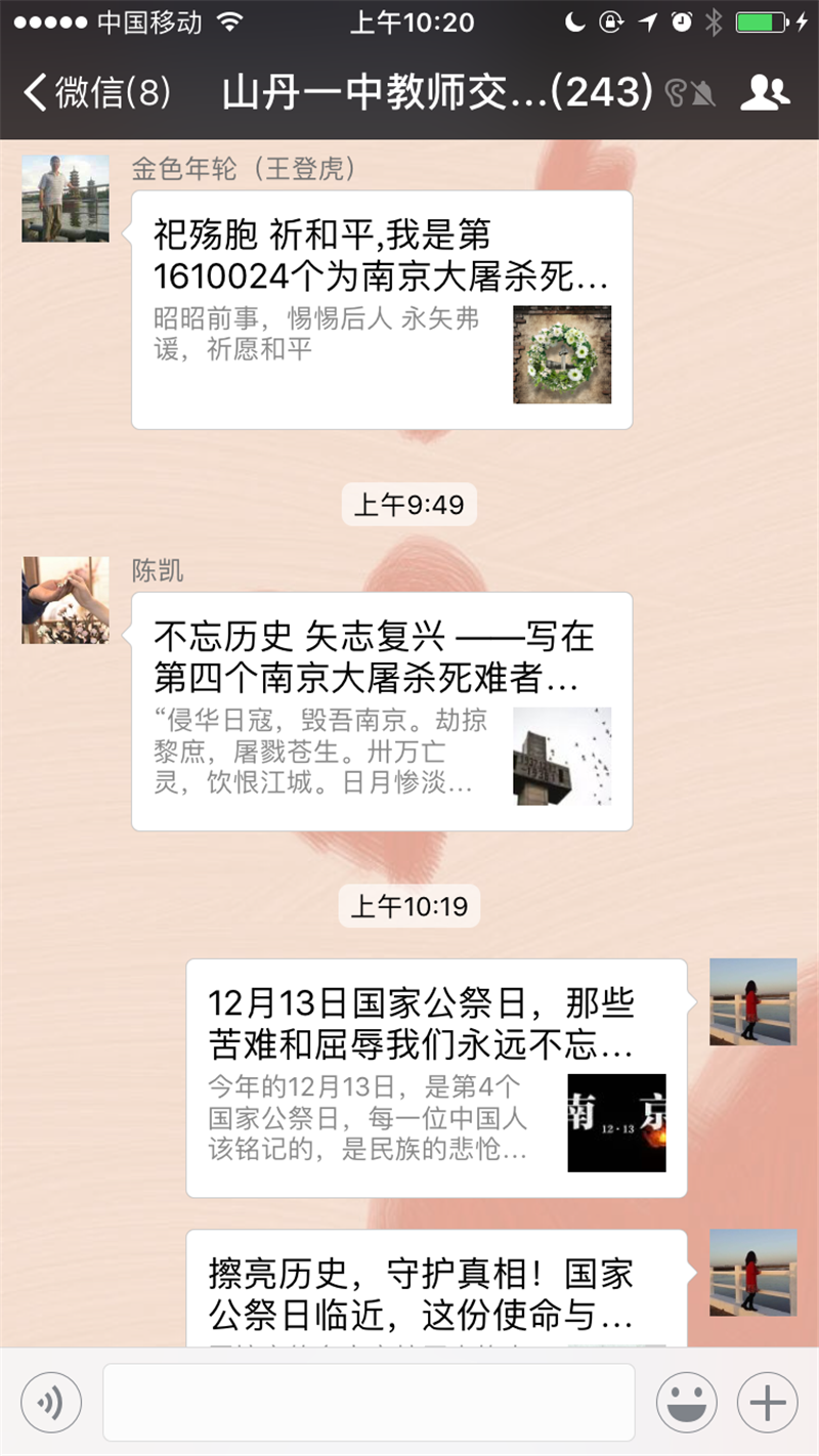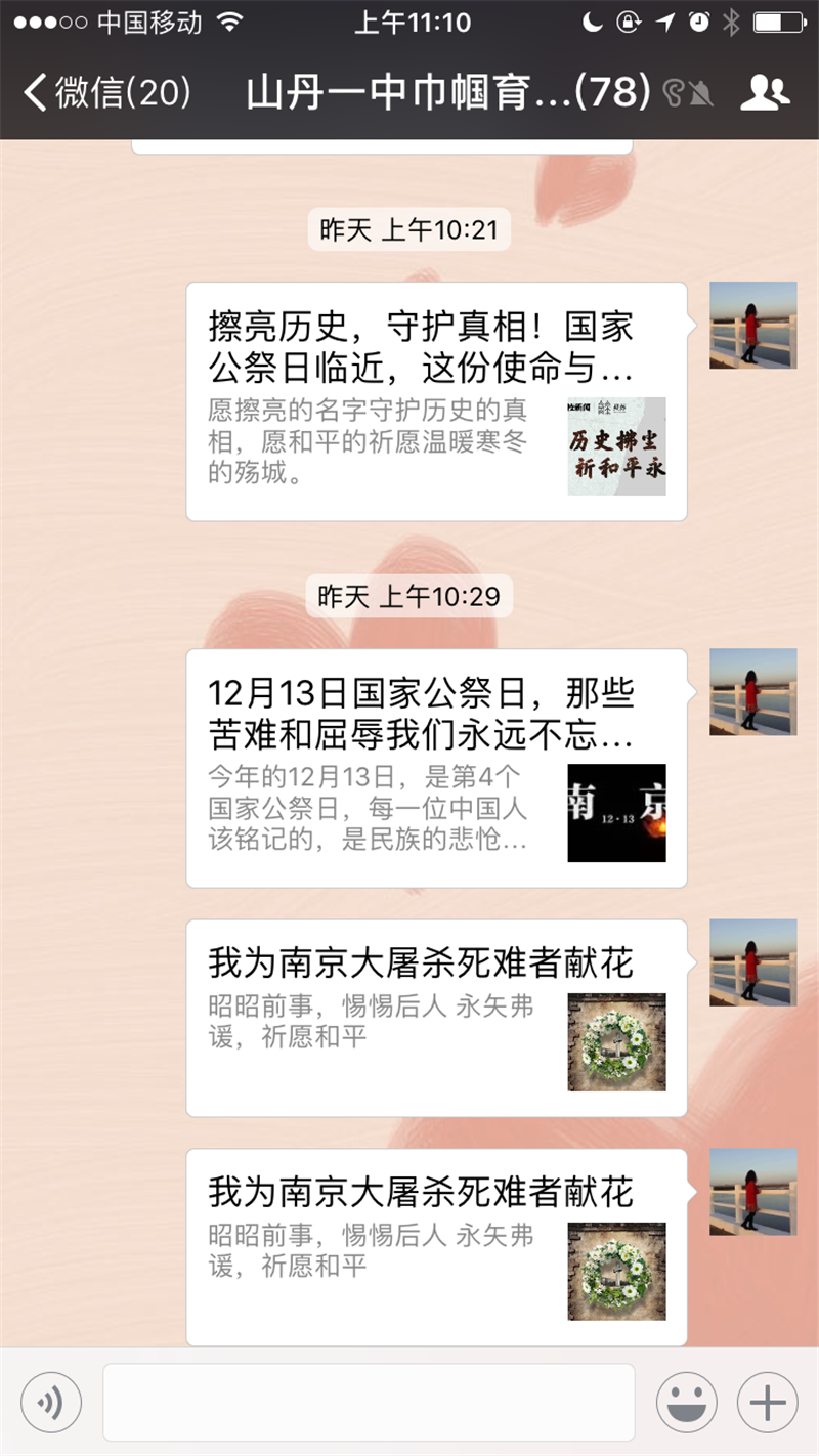 为了永不忘却的纪念,2017年国家公祭日来临之际,山丹一中为深入学习贯彻党的十九大精神,大力弘扬爱国主义教育为核心的名族精神,在学校营造“铭记历史、不忘过去、珍爱和平、开创未来”的浓厚氛围,汇聚起同心共筑中国梦的磅礴力量,各班班主任组织学生利用多媒体设备集中观看国家公祭仪式。同时,学校利用教师微信平台和妇女微信平台在教师中间互相学习,相互勉励,表明我们热爱和平的态度和立场。