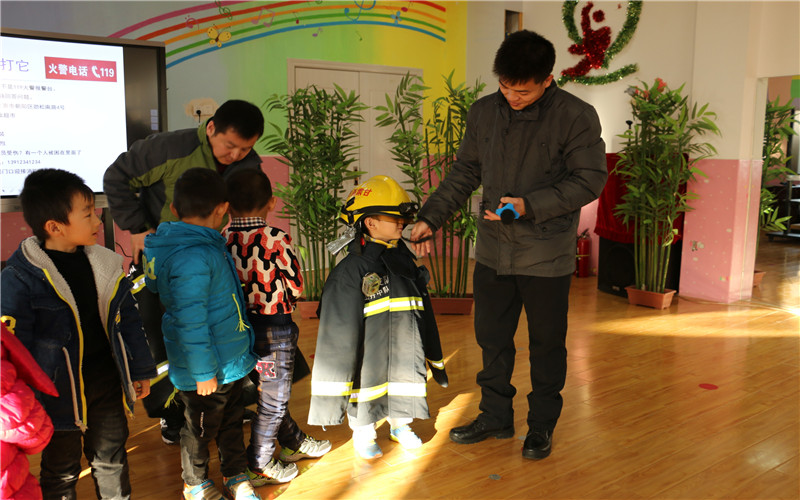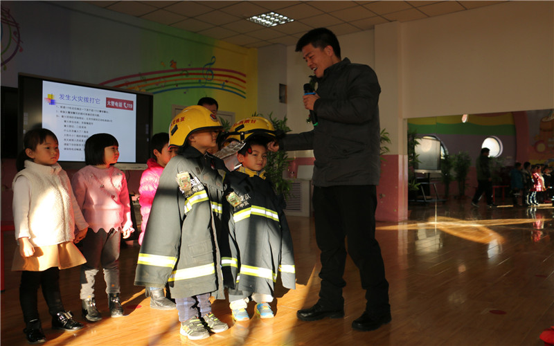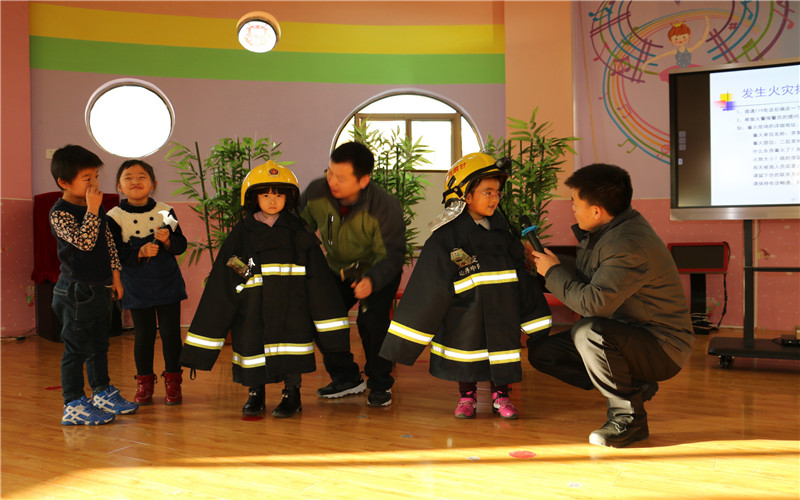 首先为宝宝们助教活动的是原消防战士黄建平,他充分发挥自己的专业特长,为孩子们带来了一节生动的消防安全教育课。活动中志远爸爸带孩子认识灭火器、消防服、消防帽、借助PPT课件向听讲的教师、孩子们讲解诱发火灾的危险物品、原因及火灾发生时的逃生求救方法及处理办法。志远爸爸还和孩子们进行了互动,让孩子们了解在什么情况下拨打火警电话和打电话时必须要告诉消防警察的几个要点,不仅如此,细心的志远爸爸还教会孩子们被困电梯的应急措施,并且大班组教师现场现场操作灭火器,要求孩子们聚精会神的观察。活动最后志远爸爸还邀请五个班级的十名孩子上去,体验穿上消防服的感觉,以此培养孩子们从小树立保家卫国的远大志向。通过这节家长助教活动中,孩子们知道了在日常生活中要做到不玩火、不玩电、遇到危险时要想办法自救。同时也深刻认识到消防安全在生活中的重要性。