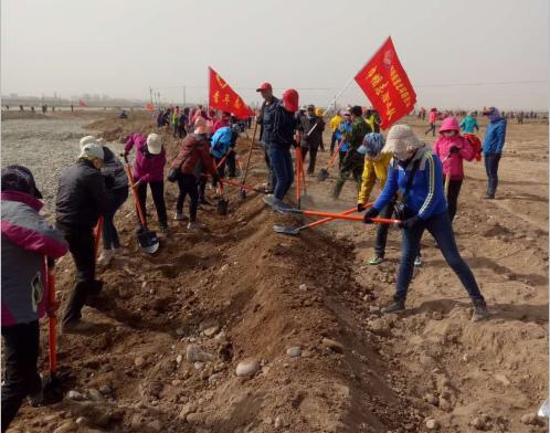 在植树现场,彩旗飘飘,人潮涌动,呈现出一派热火朝天的繁忙景象。女同志们热情高涨,按照划分好的区域,撸起袖子、放线定行、挥锹平地、整垄地埂,每道工序都做得细致认真,配合默契,充分展现了妇女干部们团结互助的精神风貌。