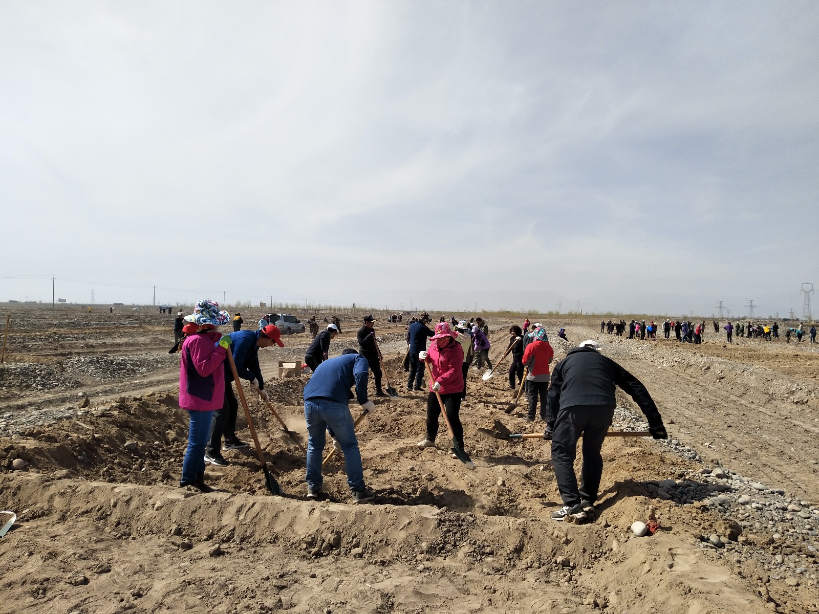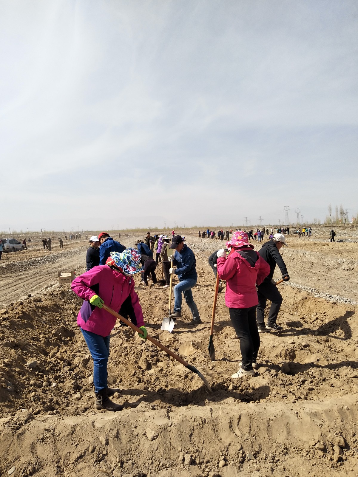 植树现场,女干部们分工合作、互相帮助,大家挥锹铲土、平地、拉线、打格、加埂,认真完成每一项工序,洋溢着一派热火朝天的景象。
