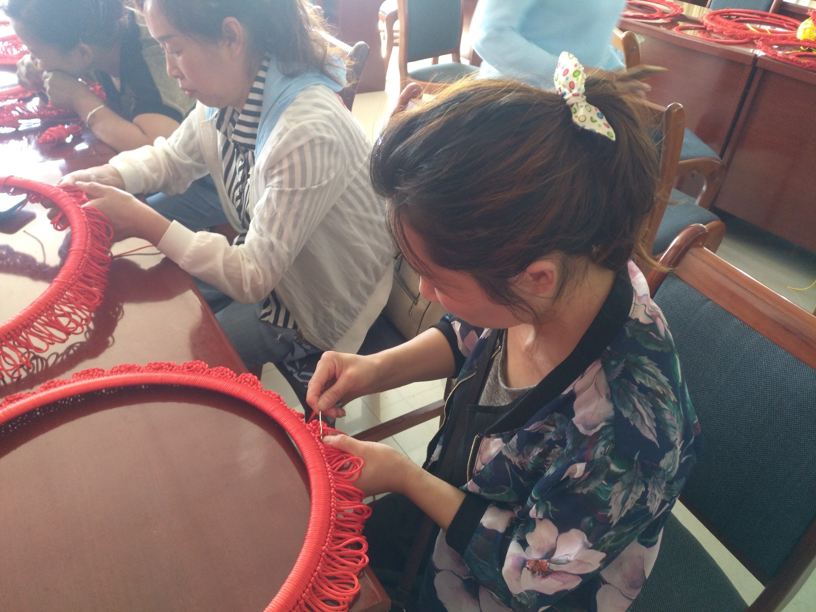 本次培训班为期2天,培训内容为多元素中国结,邀请高台县红色文化艺术发展有限公司的专业老师进行现场授课。培训现场,培训老师对中国结内外圈、外圈花瓣、福字花、纽花、等环节进行了一对一指导。作品完成后,参训人员很有成就感,纷纷展示了自己的作品。