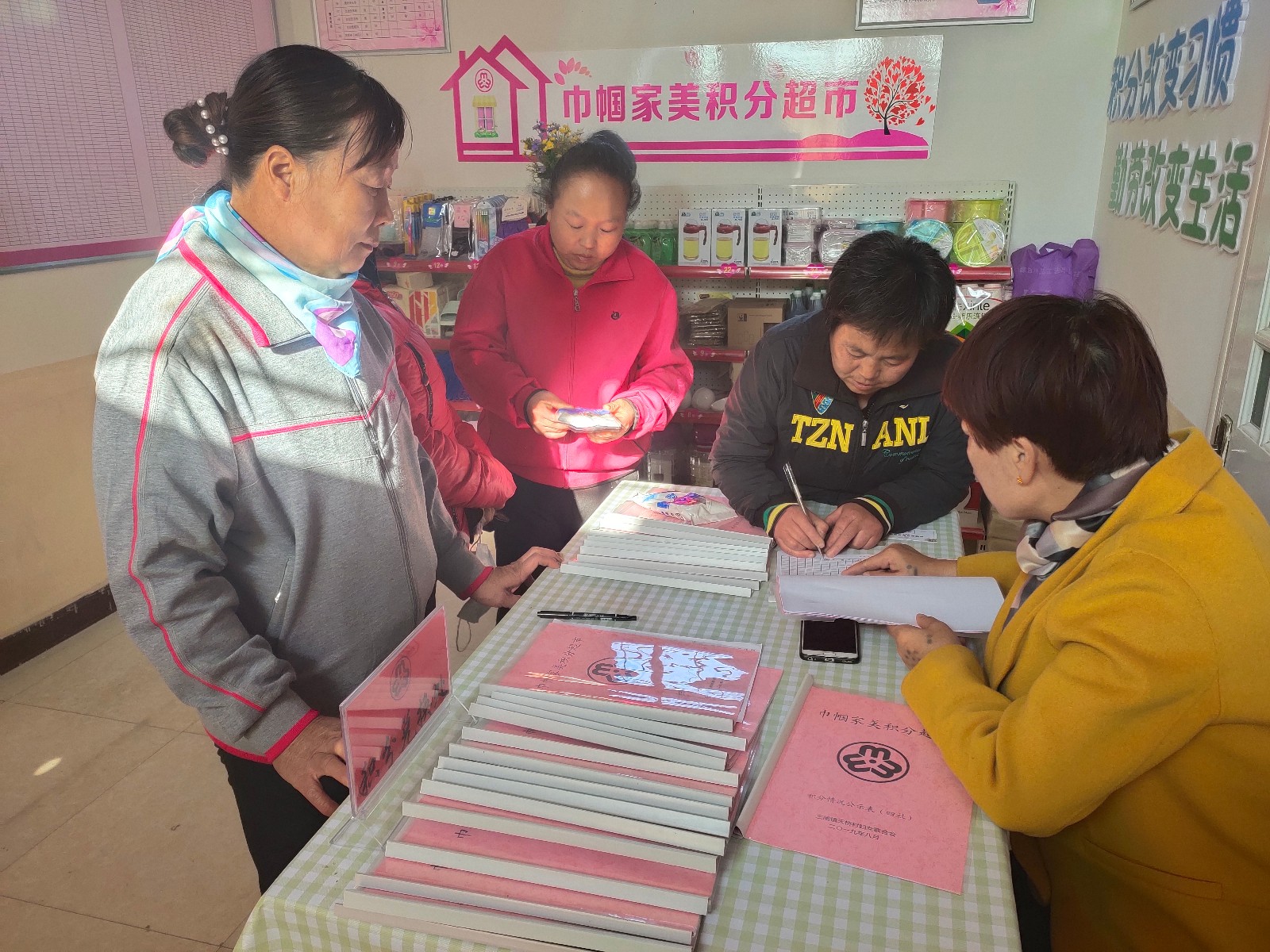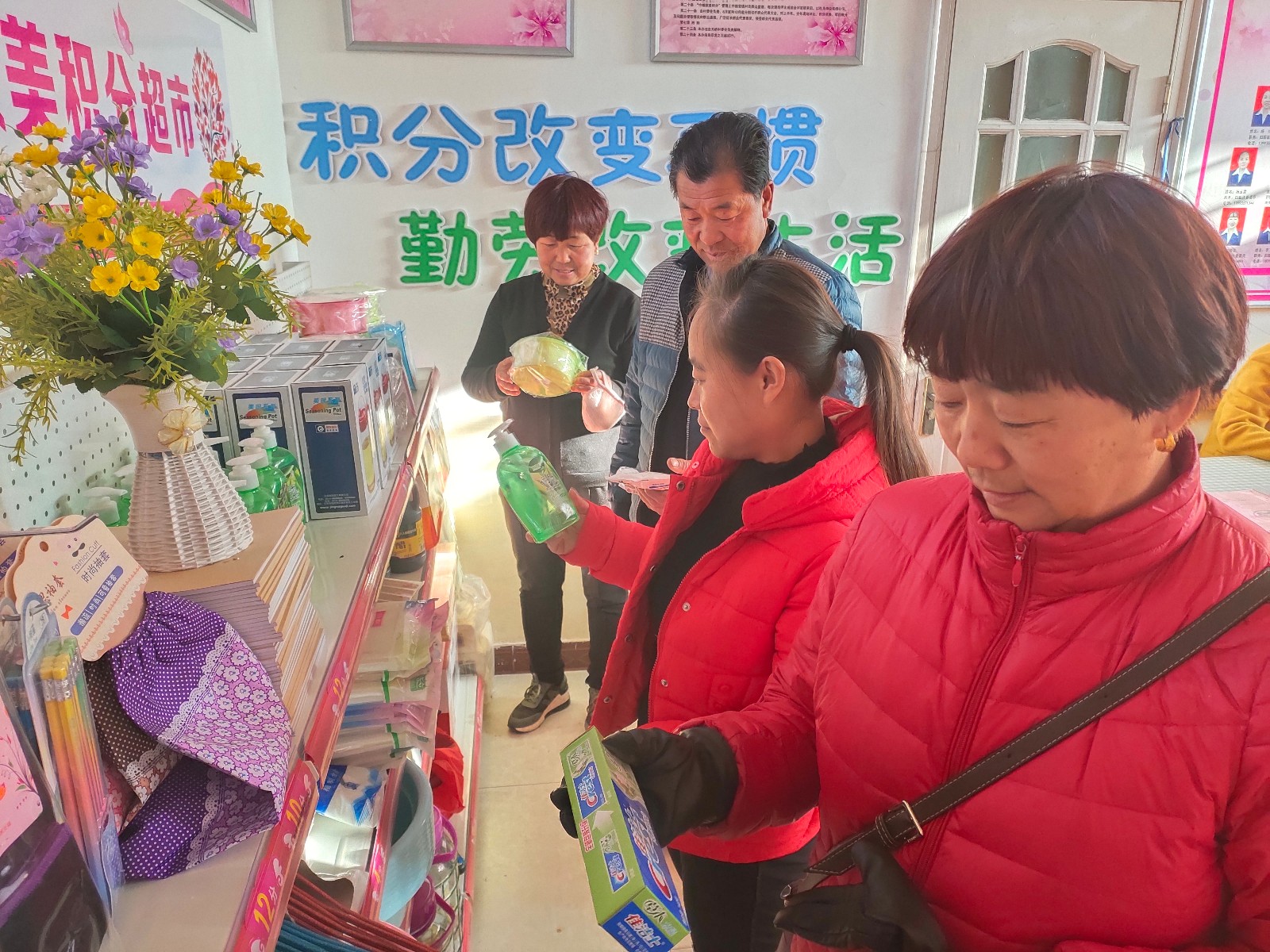 11月4日下午2:30分,在甘州区三闸镇天桥村的巾帼家美积分超市内聚集了不少正在兑换商品的群众。