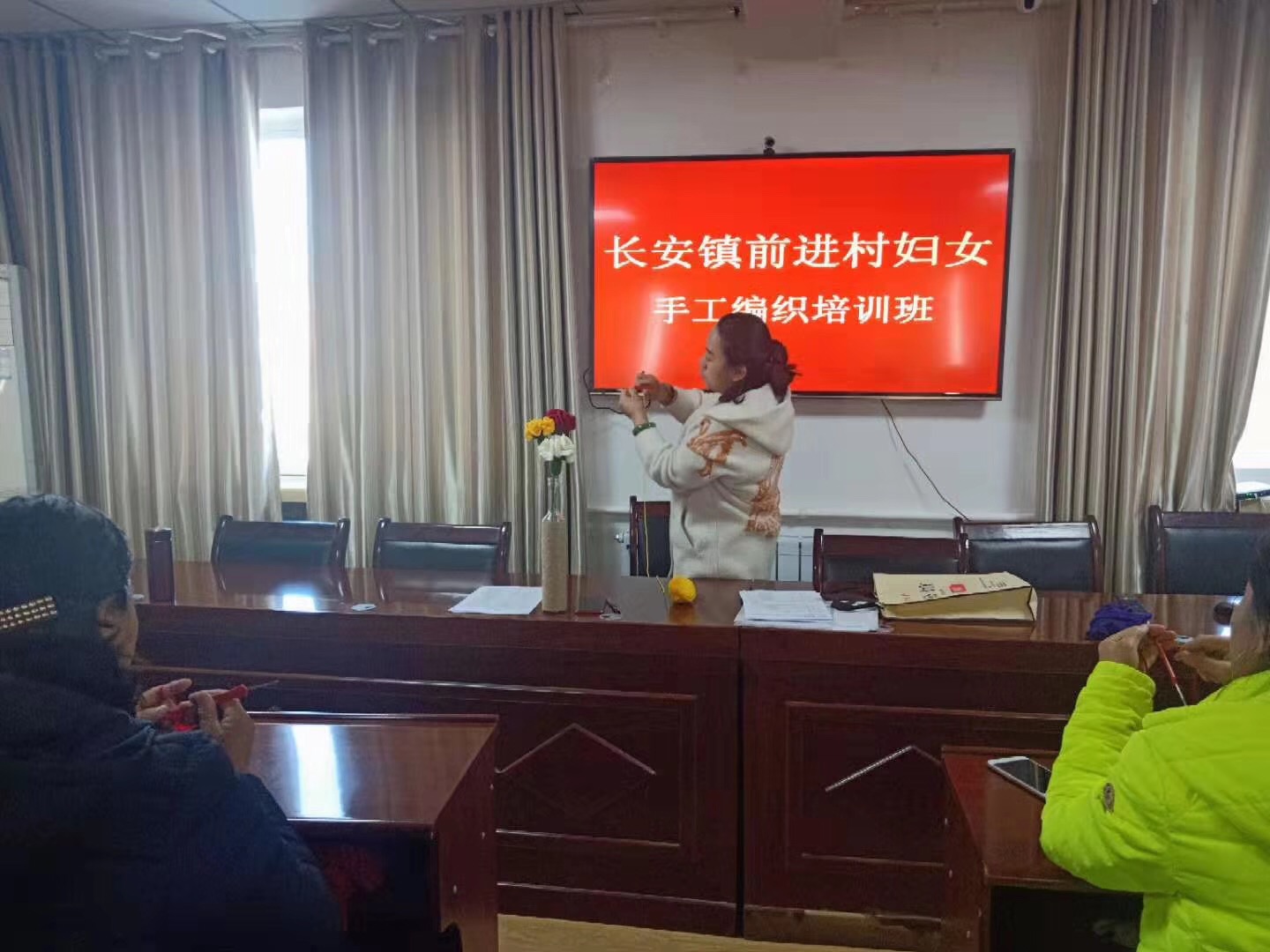 此次培训班由甘州区妇女编织协会的老师进行授课,课程采用理论讲解、现场制作、一对一指导的方式进行讲授,讲授了用毛线钩织康乃馨、玫瑰等工艺品的手法和技巧。老师通俗易懂的语言和手把手教学讲解,深受参加培训妇女的喜爱,学员热情高涨,全神贯注地听老师讲解,认真揣摩,现场学习气氛十分热烈。