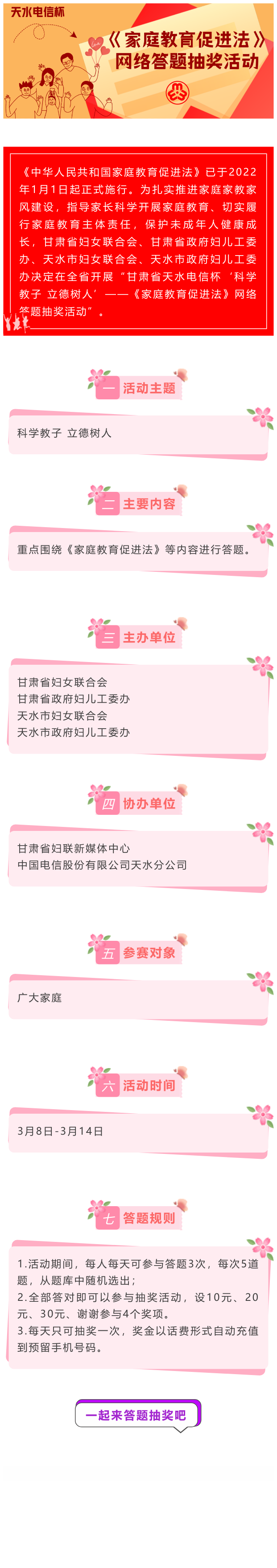 答题赢话费 | 甘肃省天水电信杯“科学教子 立德树人”——《家庭教育促进法》网络答题