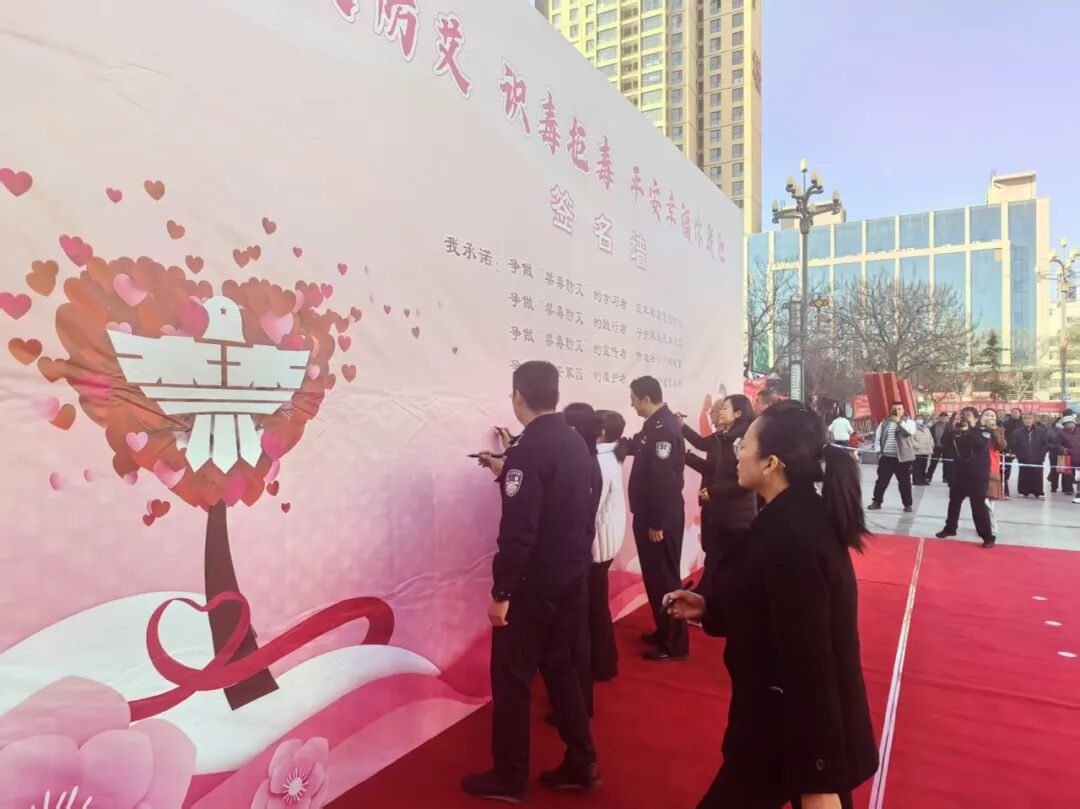 的禁毒防艾倡议声中拉开帷幕。巾帼志愿者面向现场群众宣读倡议书,以铿锵有力的话语发出“珍爱生命、远离毒品、科学防艾”的号召。随后,省妇联、省禁毒办相关领导为榆中县蓝天救援队“禁毒志愿服务队”和榆中县城关镇朝阳路社区“妈妈禁毒队”授旗,标志着基层禁毒志愿服务队伍又添新力量,为构建社会化禁毒网络注入了巾帼动能。在代表发言环节,“妈妈禁毒队”代表在发言中表达了筑牢禁毒防艾战线的坚定决心,质朴而坚定的话语道出了全体巾帼志愿者的心声。发言结束后,参与活动的领导、志愿者及群众纷纷走向禁毒防艾承诺签名墙,郑重签下自己的名字,以实际行动践行禁毒防艾的坚定庄严承诺,签名现场气氛热烈,一笔一划都承载着大家对美好生活的向往与追求。金崖镇“禁毒妈妈志愿服务队”带来的太平鼓表演将现场气氛推向高潮,既展现了黄土高原的民俗风情,更以群众喜闻乐见的形式传递着禁毒防艾的决心。