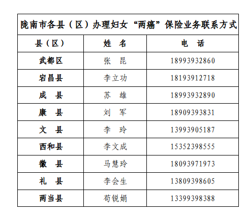 注:各县区都有专属“两癌”保险业务经理,有疑问可以随时咨询。