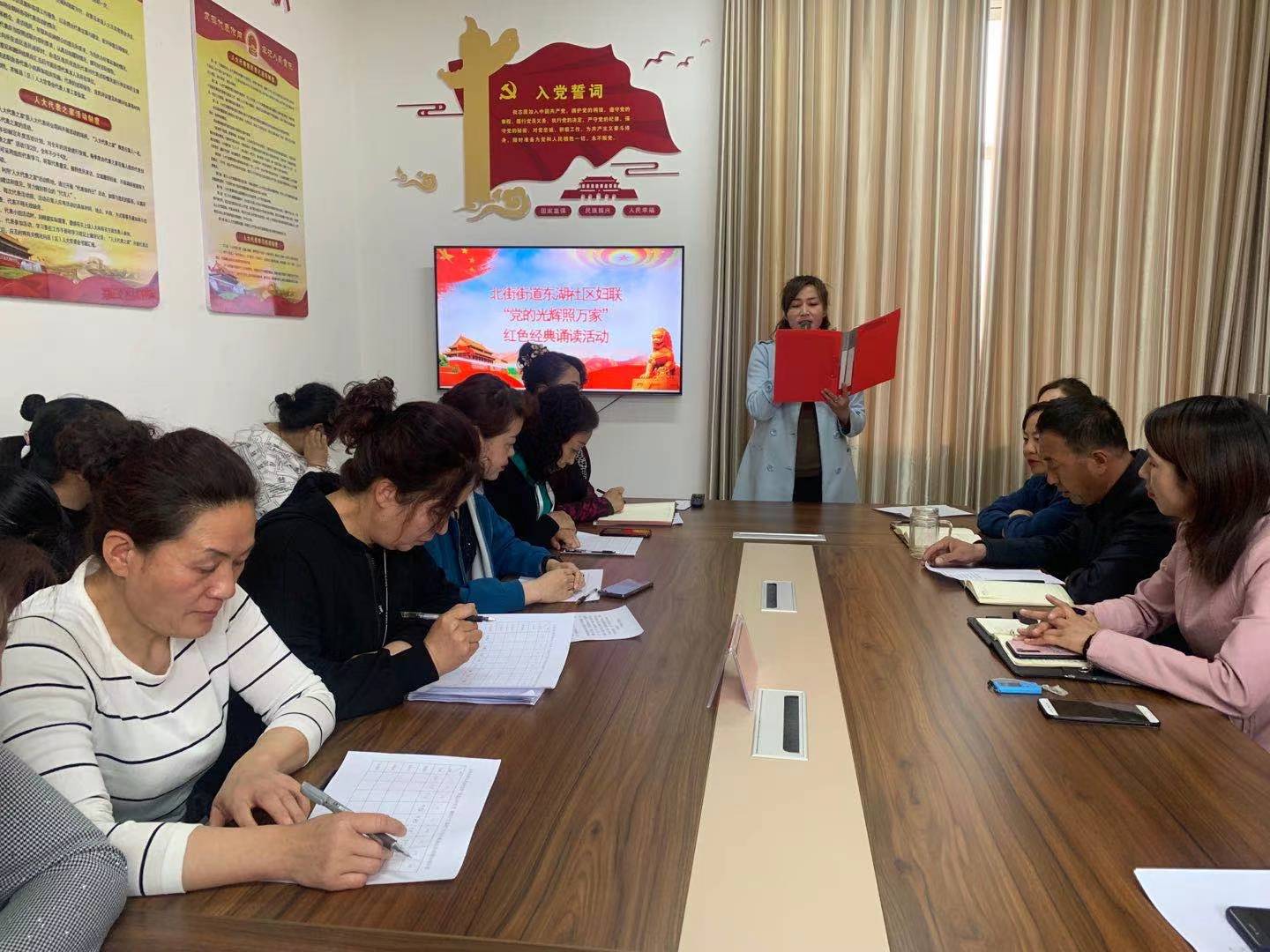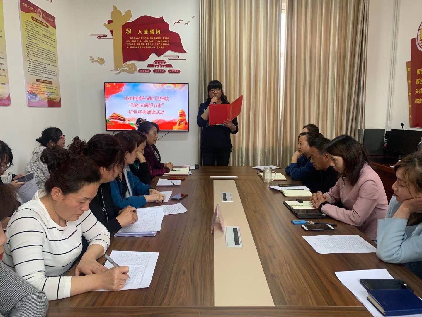4月26日,一场以“党的光辉照万家”为主题的红色经典诵读大赛在北街街道东湖社区隆重举行,全体妇女、计生协会员、辖区妇女代表部60多人参加。一个铿锵有力的声音,感人肺腑的话语《永远跟党走》拉开帷幕,在参赛选手饱含深情的诵读声中,让我们感受到了青春的热情、青春那火热的理想。接下来的朗诵《长征精神:雄关漫道真如铁,而今迈步从头越》回首峥嵘岁月,感受英雄气概;讲述故事《见证初心和使命的“十一书”—陈然的“明志书”》、《红船,从南湖起航》等作品,带领现场人员进了那个激情燃烧的岁月和热血沸腾的年代,生动展现了革命先辈崇高的理想信念。选手们激情澎湃地诵读,将现场听众带回到英烈生活的年代,重温感人至深的英烈事迹,回顾党的百年征程。(杨冬梅)