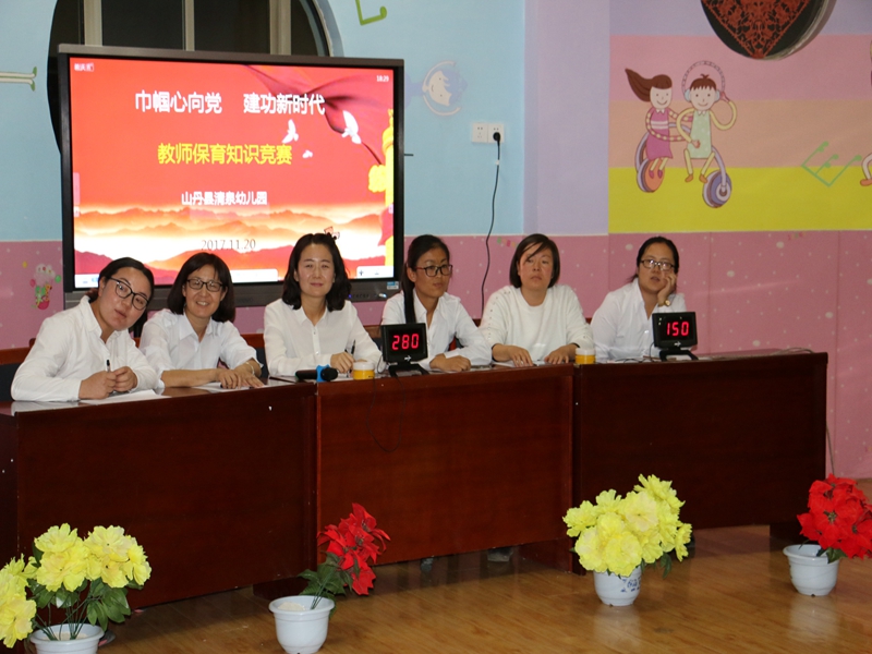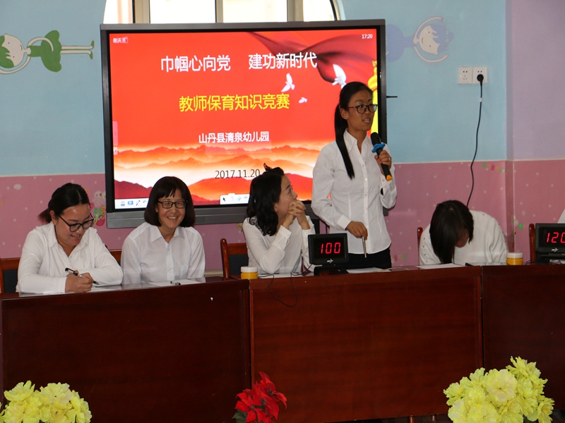 为学习贯彻党的十九大精神,进一步提高教师综合素质,激励广大教师更好的教书育人。清泉幼儿园于2017年11月20日下午四点在幼儿园艺术厅举办了“巾帼心向党,建功新时代”教师保育知识竞赛,此次竞赛,旨在提高教师的保育理论知识精准度,让老师更好的服务幼儿,切实增强全园教师的凝聚力、向心力,展示我园教师的巾帼风采。