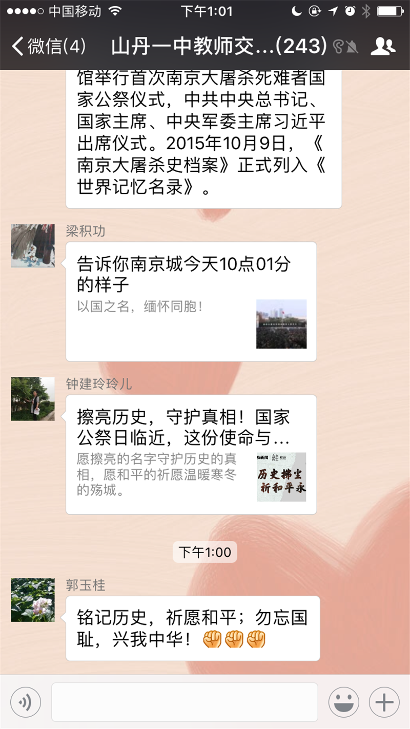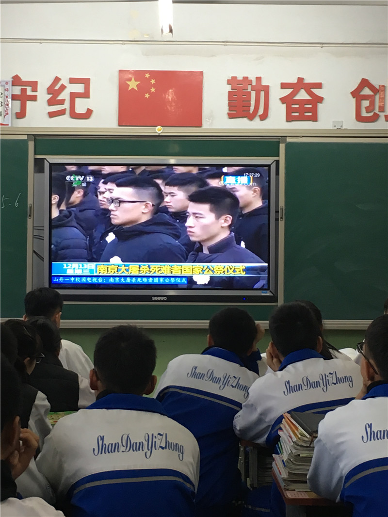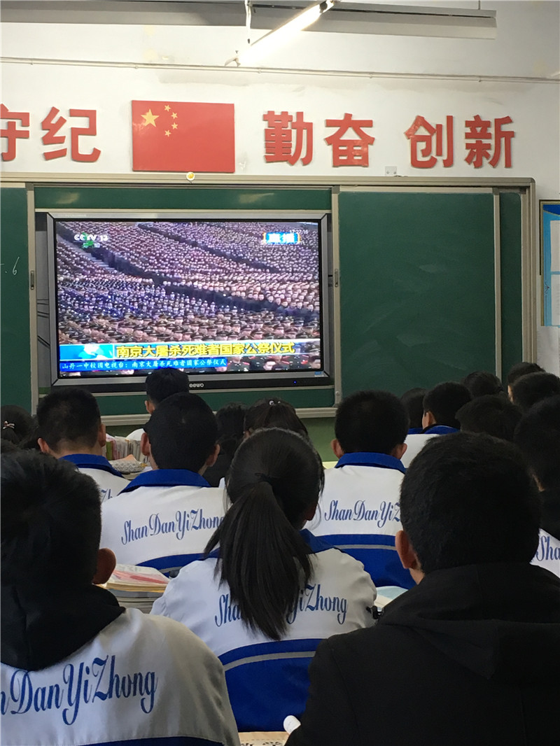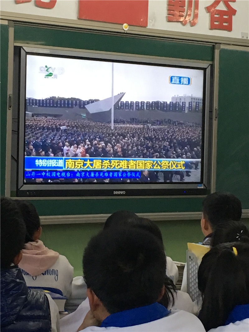 为了永不忘却的纪念,2017年国家公祭日来临之际,山丹一中为深入学习贯彻党的十九大精神,大力弘扬爱国主义教育为核心的名族精神,在学校营造“铭记历史、不忘过去、珍爱和平、开创未来”的浓厚氛围,汇聚起同心共筑中国梦的磅礴力量,各班班主任组织学生利用多媒体设备集中观看国家公祭仪式。同时,学校利用教师微信平台和妇女微信平台在教师中间互相学习,相互勉励,表明我们热爱和平的态度和立场。