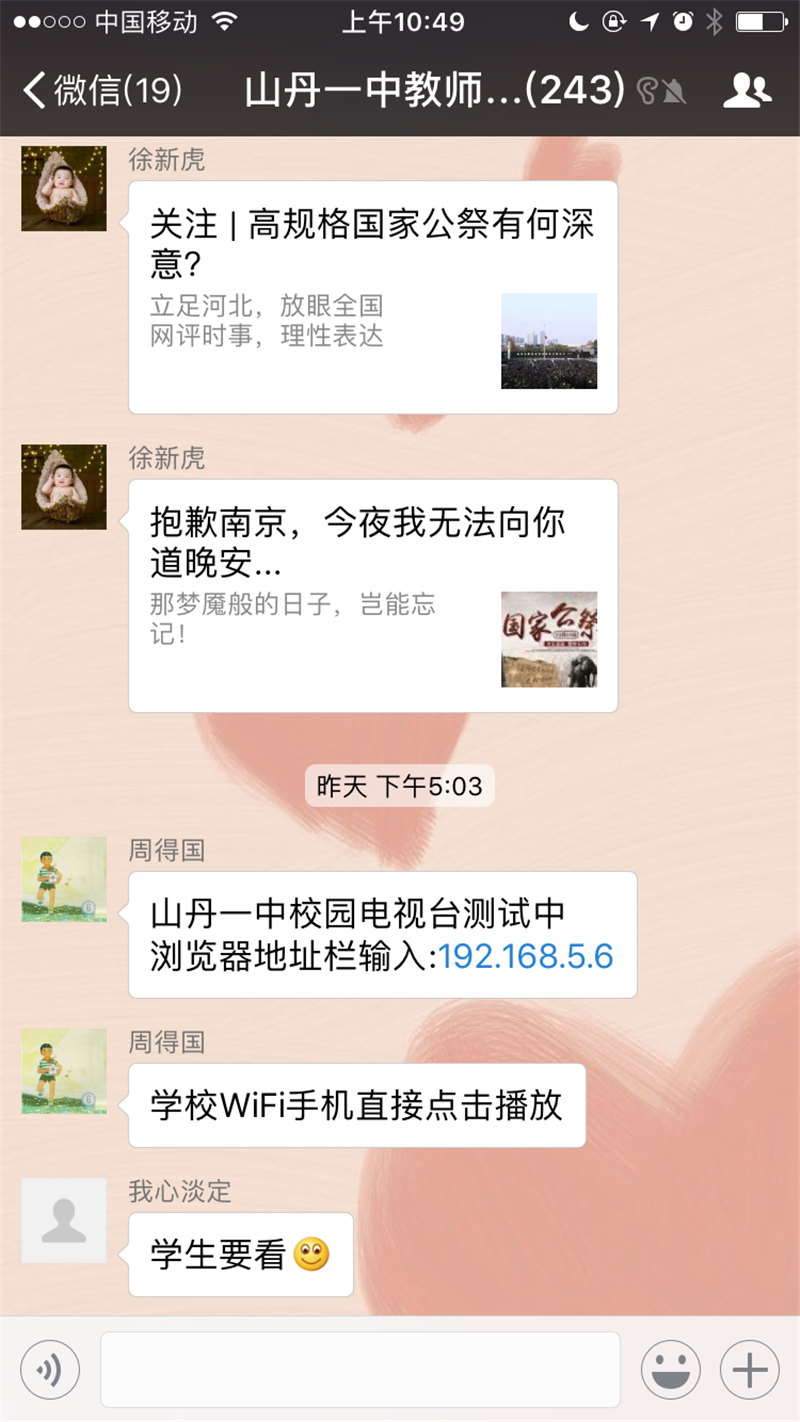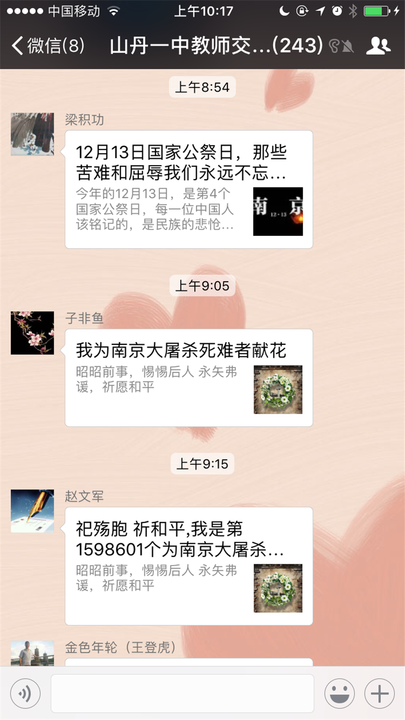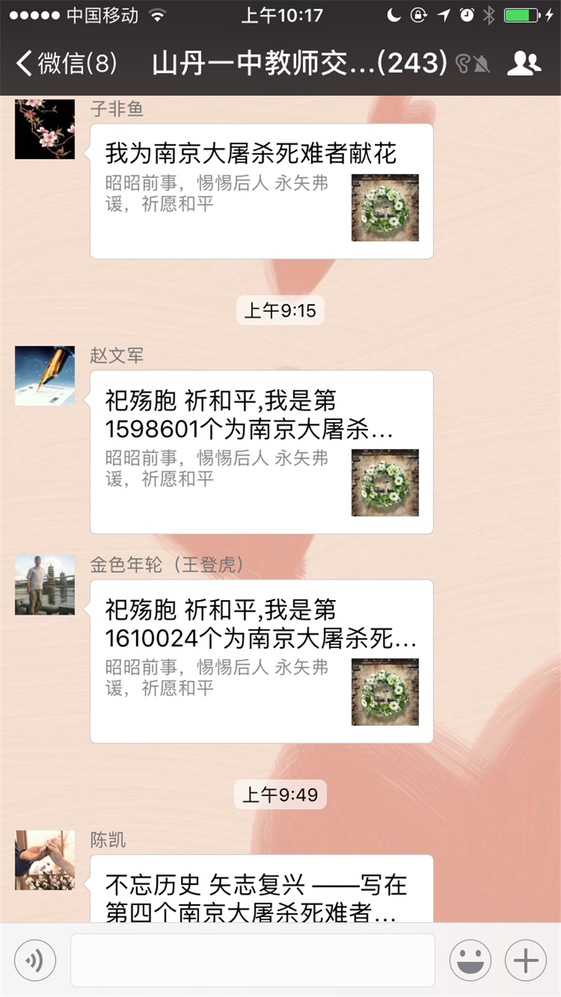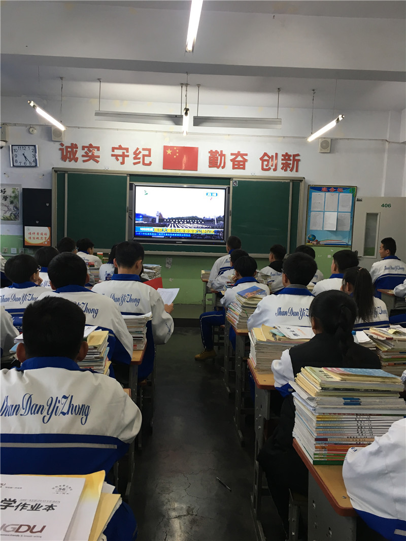 为了永不忘却的纪念,2017年国家公祭日来临之际,山丹一中为深入学习贯彻党的十九大精神,大力弘扬爱国主义教育为核心的名族精神,在学校营造“铭记历史、不忘过去、珍爱和平、开创未来”的浓厚氛围,汇聚起同心共筑中国梦的磅礴力量,各班班主任组织学生利用多媒体设备集中观看国家公祭仪式。同时,学校利用教师微信平台和妇女微信平台在教师中间互相学习,相互勉励,表明我们热爱和平的态度和立场。