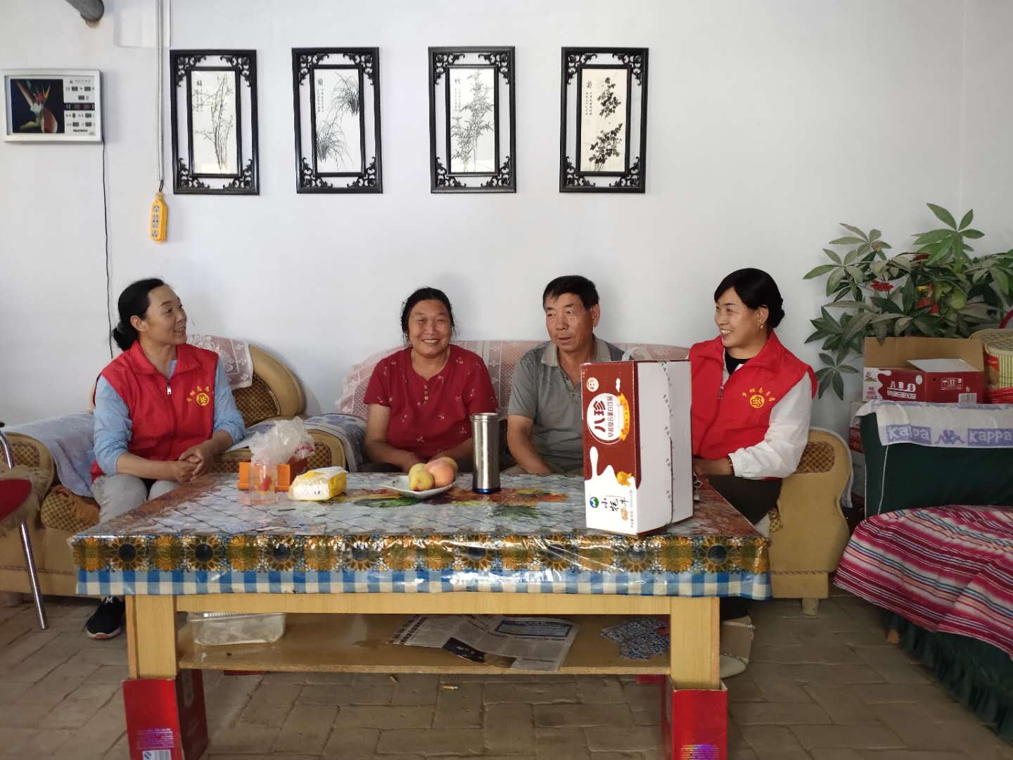 胜利村巾帼志愿者邀请南华卫生院妇幼专干来到胜利村现役军人安龙家中为他的爱人和新生婴儿做产后访视工作,小海子村、永进村巾帼志愿者则到退役老兵家中,为他理发,巾帼志愿者们围坐在一起,认真聆听他们讲述自己当兵的往事。听完故事后,巾帼志愿者帮助退伍老兵们打扫卫生、清洗衣物,让他们度过了一个幸福的节日。