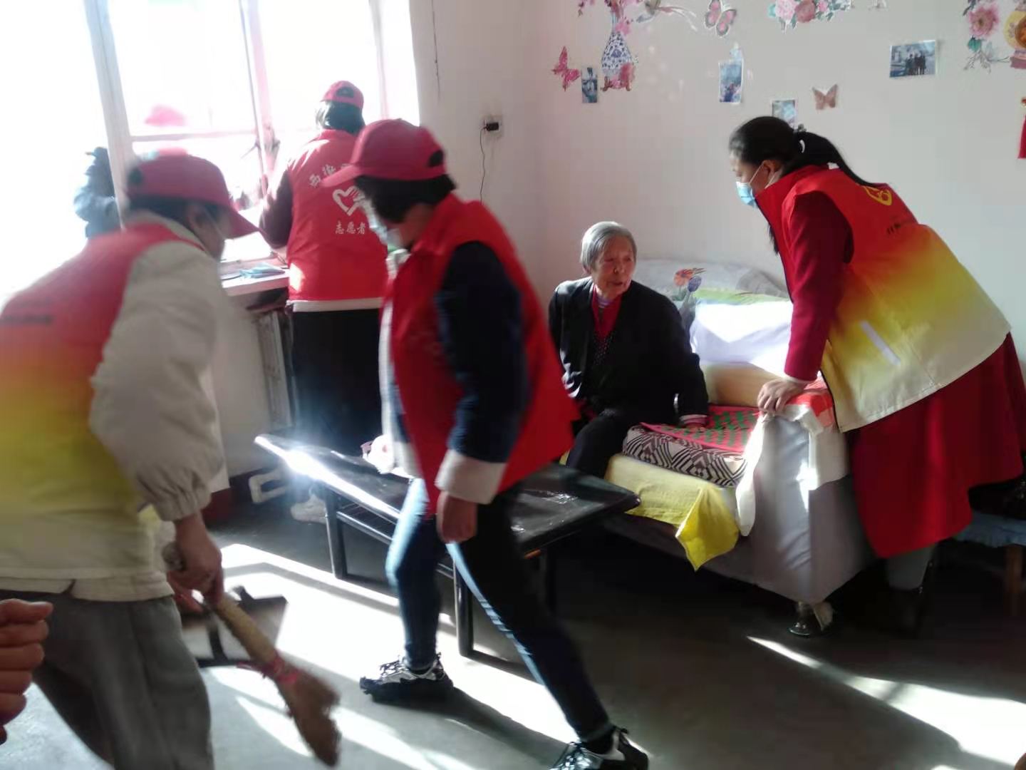 志愿者们来到孤寡老人杨国英家中,为她打扫卫生,收拾衣物床铺,询问老人身体情况后与老人聊天,拉起家常,询问老人生活上的困难,了解她的精神状态,有针对性地进行心理咨询和心理疏导,使其摆脱孤独寂寞,保持健康的精神状态。