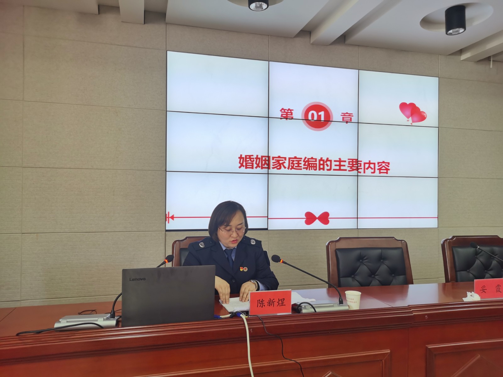 启动仪式上,全市最美家事调解员、市妇女儿童维权服务专家团宣讲成员、红湾寺镇司法所所长陈新煜以《婚姻家庭中的爱与责任—《民法典》婚姻家庭编解读》为题开展了《民法典》解读讲座。陈新煜同志的讲座生动精彩,既精辟深刻,又引人入胜,含金量很高,她针对《民法典》婚姻家庭编大家关注的热点难点,以她多年从事基层司法调解工作的实践经验,用深入浅出通俗易懂的语言、大量生动丰富的典型案例、引经据典地解读了《民法典》婚姻家庭编,使参加讲座人员对运用《民法典》开展妇女儿童权益维护工作有了更加清晰、更加深刻的认识理解和更直观的体验,为更好地维护妇女儿童合法权益提供了借鉴、积累了经验。