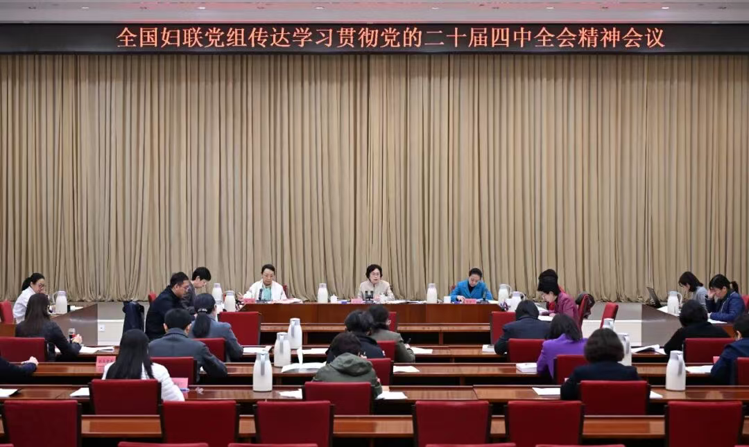 10月24日,全国妇联党组召开会议,传达学习习近平总书记重要讲话和党的二十届四中全会精神,部署贯彻落实工作。全国妇联党组书记、副主席、书记处第一书记黄晓薇主持会议并讲话,强调要把学习宣传贯彻习近平总书记重要讲话精神和全会精神作为当前和今后一个时期的重大政治任务,深刻领悟“两个确立”的决定性意义,增强“四个意识”、坚定“四个自信”、做到“两个维护”,团结引领广大妇女坚定不移听党话、跟党走,为续写经济快速发展和社会长期稳定两大奇迹新篇章、开创中国式现代化建设新局面,更好发挥“半边天”作用。