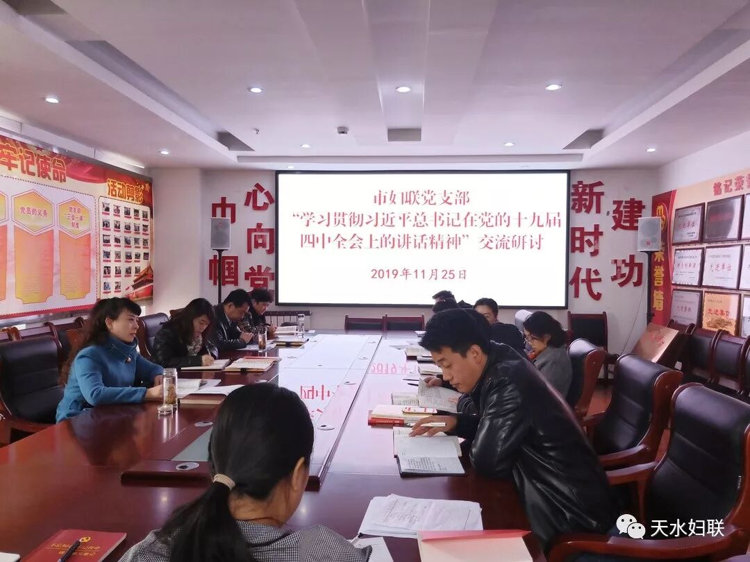 会议集体学习了党的十九届四中全会《公报》《决定》及习近平总书记在党的十九届四中全会上的讲话精神,何忠兰、张冬梅、张亚龙、曹亚玲紧扣研讨交流主题,紧密联系妇联工作实际,作了交流发言。 会议强调,要把学习宣传贯彻党的十九届四中全会精神作为市妇联党组首要政治任务,党组成员要做好学习的表率,继续深入学习、分层次抓好学习,结合正在开展的“不忘初心、牢记使命”主题教育,扎实学习,用理论武装头脑、指导工作;党组成员要做好宣传的表率,党组成员要结合即将开展的十九届四中全会精神宣讲活动,有计划、全覆盖开展宣讲,把全会精神传达到每一个基层妇联组织、每一名妇女群众;党组成员要做好践行的表率,坚决贯彻习近平总书记系列讲话精神和重要指示,勇于担当推动落实,切实增强妇联组织的政治性、先进性、群众性,推动全会精神在全市妇联系统落地生根。 11月25日下午,天水市妇联党支部召开学习贯彻习近平总书记在党的十九届四中全会上的讲话精神专题学习研讨。市妇联党支部书记张冬梅主持会议,市妇联机关全体党员干部参加学习研讨。 会议集体学习了党的十九届四中全会《决定》及习近平总书记在党的十九届四中全会上的讲话精神,机关全体党员干部紧扣交流研讨主题,结合自身学习感悟、认识体会和工作实际,分别作了交流发言。 会议指出,全体党员干部在学深悟透全会精神上还有差距,没有结合妇联工作实际、没有做到知行合一,要继续在加强学习、推动落实上下功夫。 会议要求,全体党员干部要提高政治站位,深刻认识和把握全会的重大意义、精神实质和丰富内涵,要把学习贯彻全会精神作为妇联首要政治任务,把学习贯彻全会精神与“不忘初心、牢记使命”主题教育紧密结合起来,认真学、深入学、全面学,做到率先垂范、知行合一;全体党员干部要创新学习形式和载体,充分运用学习强国、甘肃党建等学习平台,迅速掀起学习热潮,学以致用、以干促学;全体党员干部要把学习全会精神与妇联各项重点工作紧密结合,不断提高妇联组织引领、服务、凝聚妇女群众的能力和水平,有效增强妇女对妇联组织的依赖感、信任感,增强妇联组织的凝聚力,推动妇女事业全面发展,努力开创妇联工作新局面。