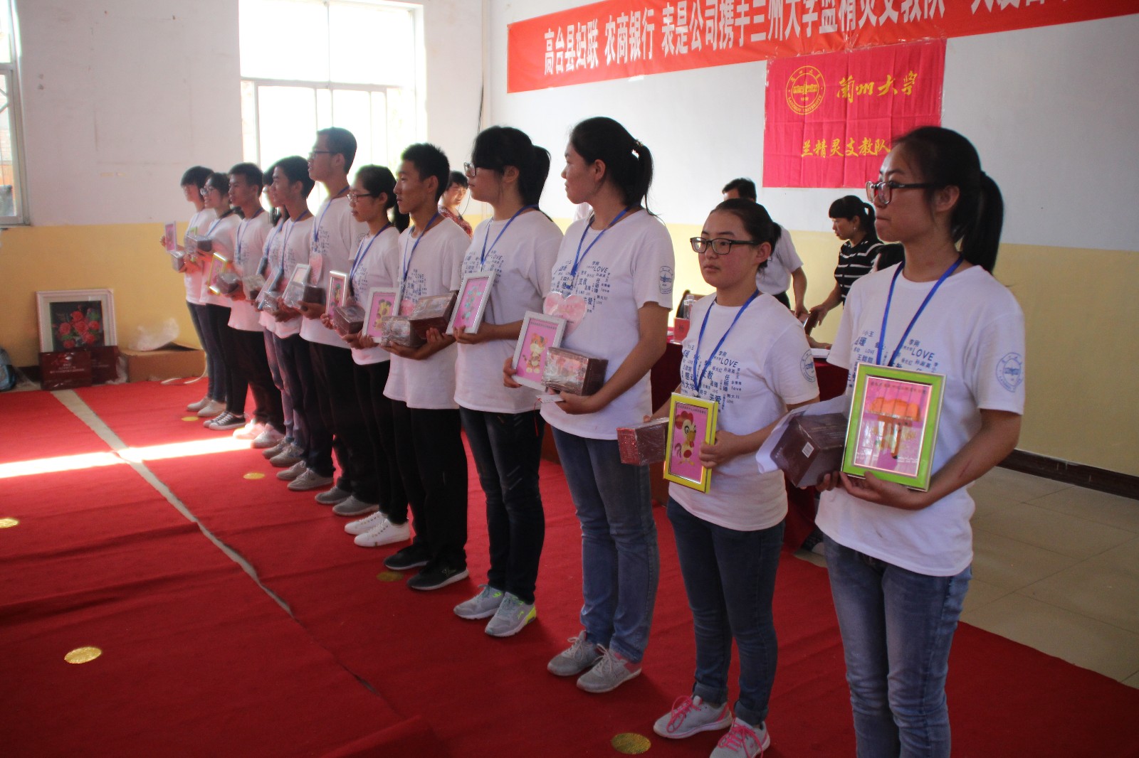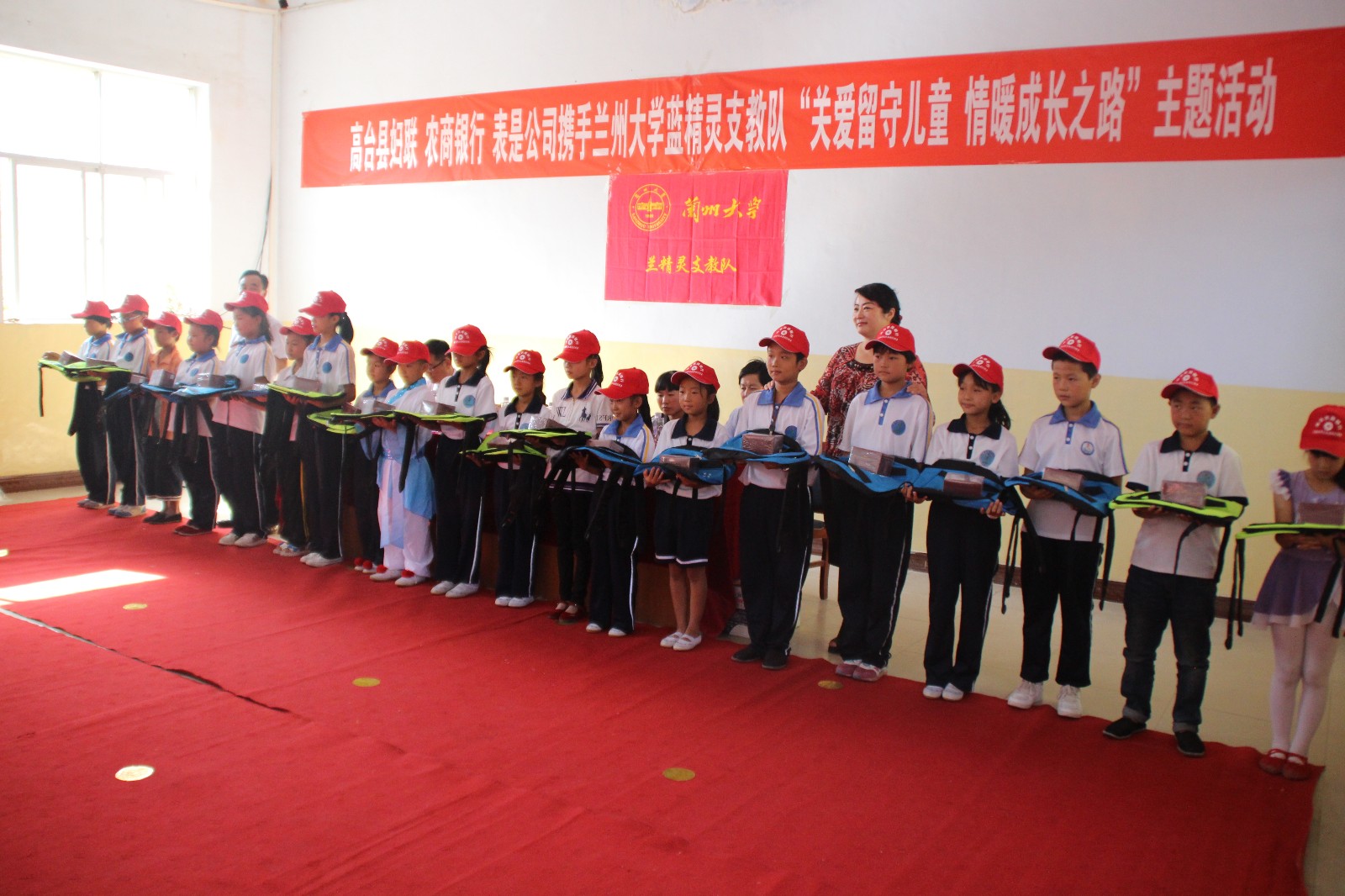 在为期20天的志愿服务留守儿童假日活动即将结束时,高台县妇联携手县农商银行、表是公司和兰州大学蓝精灵支教队开展了“关爱留守儿童·情暖成长之路”活动总结告别仪式,由县农商银行和甘肃表是文化传媒公司为74名留守儿童赠送了价值1.48万元的爱心书包、帽子及《血战高台》连环画74套;支教老师为12名优秀学生赠送了安全教育书籍和爱心礼物,并与12名贫困学生结成了“一对一”长期帮扶对子,现场互换了爱心结对连心卡;同时,黑泉镇党委和县、镇妇联为兰大支教老师赠送了本地妇女手工纪念礼物,县妇联也为县农商行和表是传媒公司赠送了我县妇女亲手制作的手工编织纪念品。最后由爱心支教队的志愿者们和孩子们一起表演了精心编排的节目,表达了对相互的不舍和美好的祝福。爱心志愿者们承诺在离开后的日子里将通过电话、书信的形式对这些孩子们进行心灵抚慰、学业解惑和成才引导,做她们生活的知情人、学习的引路人、成长的保护人,用爱心倡引风尚,用行动播撒真知,用真情升华学业。